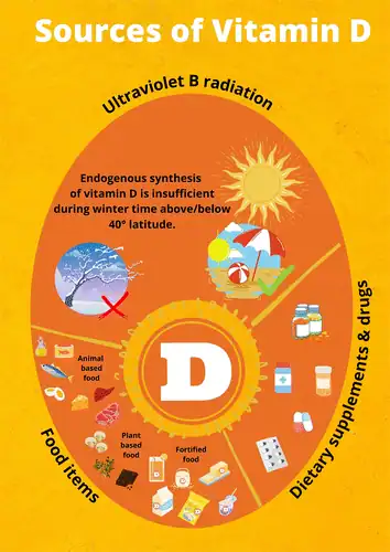 Vitamin D je v maščobi topen vitamin, ki igra pomembno vlogo pri razvoju kosti in imunskega sistema. O pomanjkanju vitamina D v vseh starostnih skupinah so veliko poročali v zadnjih letih. Pomanjkanje vitamina D se povezuje s povečanim tveganjem za srčno-žilne bolezni, raka, večjo umrljivost in avtoimunske bolezni. Do pomanjkanja prihaja predvsem zaradi sodobnega načina življenja in zaradi motenj v presnovi. Zadosten vnos vitamina D je težko doseči s prehrano, zato se priporoča uživanje prehranskih dopolnil oziroma zdravil z vitaminom D. Zadostna izpostavljenost soncu v poletnih mesecih (ultra-vijolični valovanje B, UVB) zagotavlja glaven vir vitamina D, ki se sintetizira v koži. Intenzivnost UVB se spreminja vse leto in ves dan. Najmočnejši UVB žarki so med 10. in 16. uro med majem in septembrom (nad 40° zemljepisne širine). V svetu ni univerzalnih priporočil glede količine vitamina D, ki bi jo bilo potrebno dnevno zaužiti poleg prehranskega vira vitamina D, smo pa v Sloveniji leta 2025 sprejeli prve Smernice za zadostno preskrbljenost z vitaminom D, ki so dostopne na spodnji povezavi.
